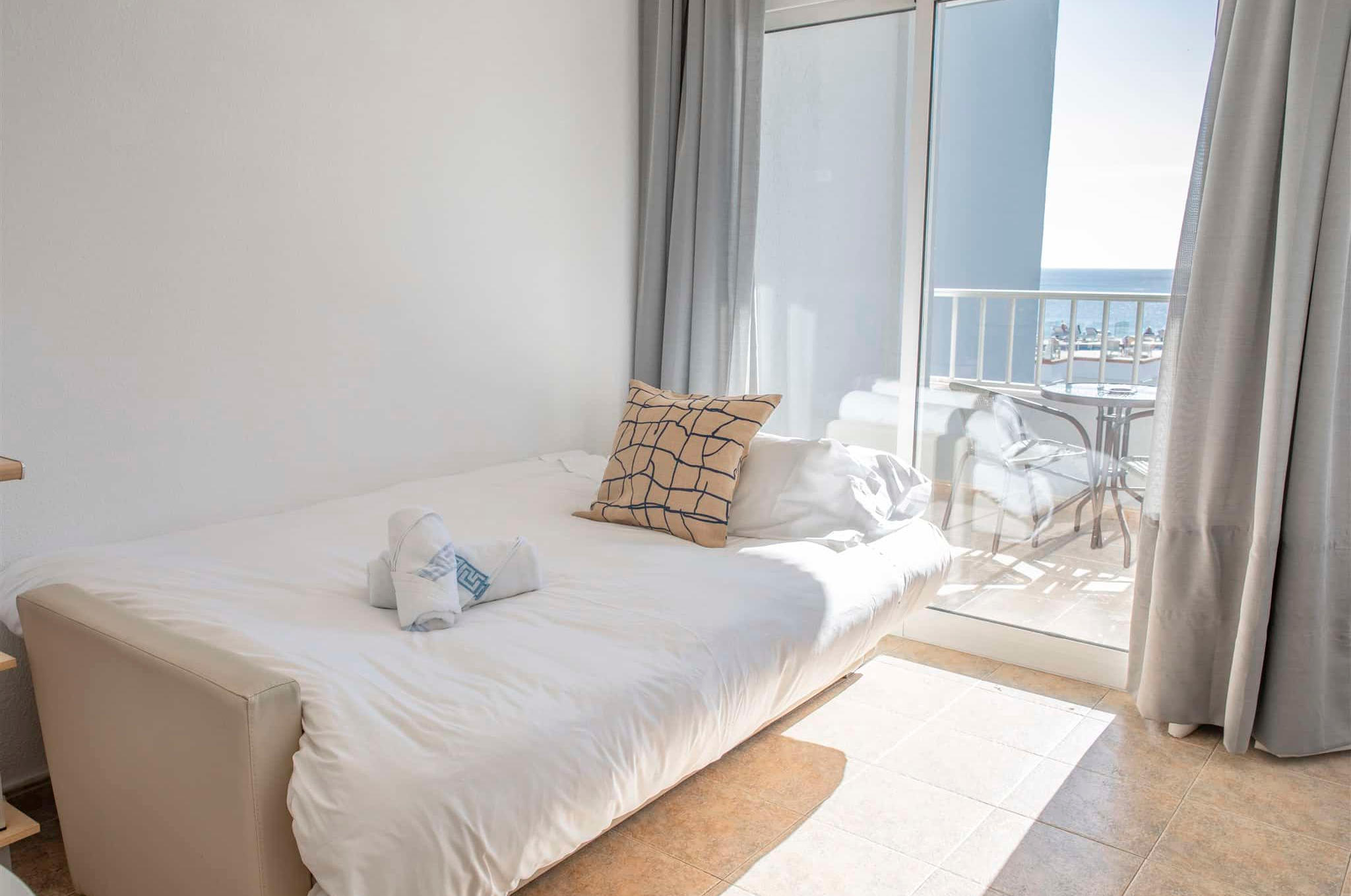 Estudio diáfano con aire acondicionado y terraza privada con vistas al mar. Incluye, o bien una cama doble o bien camas individuales, una mesa comedor con sillas y un sofá cama. La cocina tiene vitrocerámica, microondas, *mini horno/grill, tetera y vajilla. El cuarto de baño privado tiene ducha y está equipado con secador. Caja fuerte disponible.